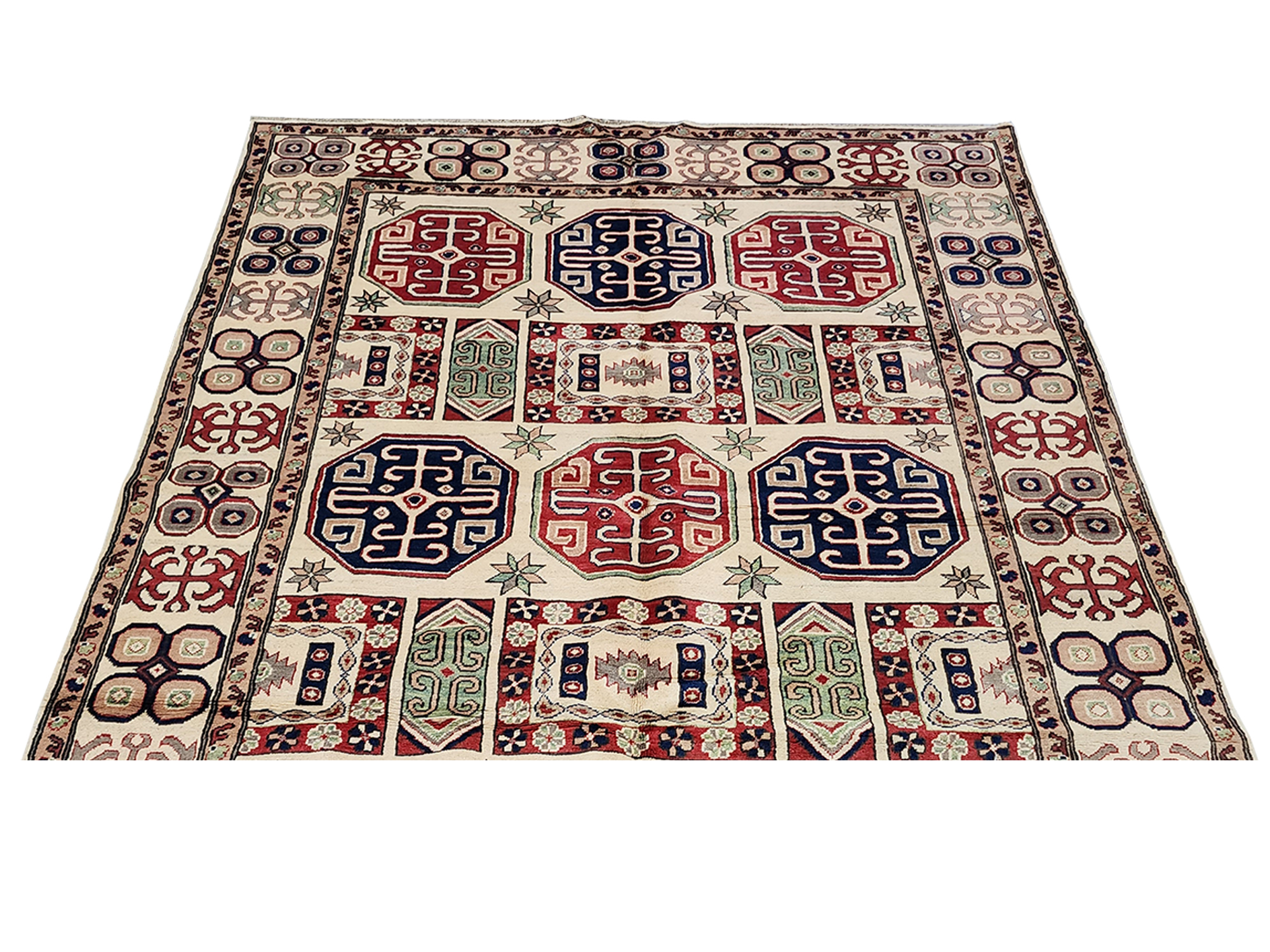 The reason for the phrase “almost entirely naturally-dyed” is because some artisans choose to augment their natural dyes with some commercially-available dyes in order to create the precise color they desire. The wool in Kazaks, like the wool found in Chobis and Gabbehs, is hand spun using a drop-spindle.